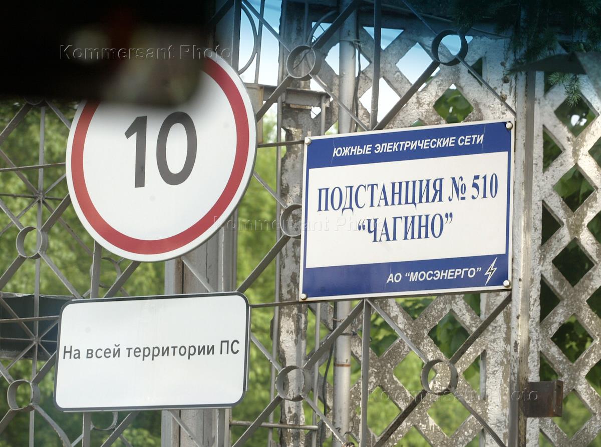 Ворота входа на территорию подстанции № 510 "Чагино". Аварийная ситуация с подачей электроэнергии в Московском регионе произошла из-за возгорания на подстанции "Чагино". Пожар на устаревшей подстанции "Чагино" привел к отключению потребителей электроэнергии всего московского региона. Пострадали Москва, Подмосковье, Калужская и Тульская области. В результате аварии разрушен трансформатор, вышли из строя 500, 110 и 220 квт линии. На нескольких линиях Московского метрополитена движение поездов было прервано.