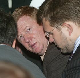 Член президиума федерального политсовета "Союз правых сил" (СПС) Виктор Некрутенко (слева) и секретарь президиума политсовета "СПС" Борис Надеждин (справа) на внеочередном съезде партии "СПС". Съезд прошел в Октябрьском зале Дома Союзов.