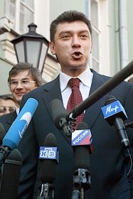 Бывший председатель партии "Союз правых сил" (СПС) Борис Немцов отвечает на вопросы журналистов после внеочередного съезда партии "СПС". Съезд прошел в Октябрьском зале Дома Союзов.