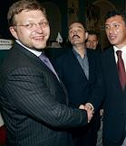 Новый лидер партии "Союз правых сил" (СПС) Никита Белых (слева) и бывший председатель партии "Союз правых сил" (СПС) Борис Немцов (справа) после внеочередного съезда партии "СПС". Съезд прошел в Октябрьском зале Дома Союзов.