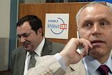 Секретарь президиума политсовета "Союз правых сил" (СПС) Борис Надеждин (слева) и президент Всероссийской ассоциации приватизируемых и частных предприятий Григорий Томчин (справа) на внеочередном съезде партии "СПС". Съезд прошел в Октябрьском зале Дома Союзов.