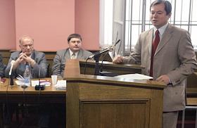 Лидер общественной общероссийской организации "За достойную жизнь", депутат Государственной Думы России Сергей Глазьев на заседании Верховного суда России, где рассматривалось исковое заявление Коммунистической партии России (КПРФ) с просьбой отменить как незаконное решение Центризбиркома, признавшего не соответствующими законодательству 15 из 17 вопросов, предлагаемых коммунистами для всероссийского референдума.