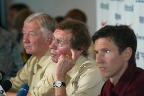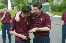 Главный тренер сборной России по футболу Юрий Семин (в центре) и капитан сборной Алексей Смертин (справа) на "Дне открытых дверей" национальной и молодежной сборных России по футболу в пансионате управления делами Президента России "Бор".