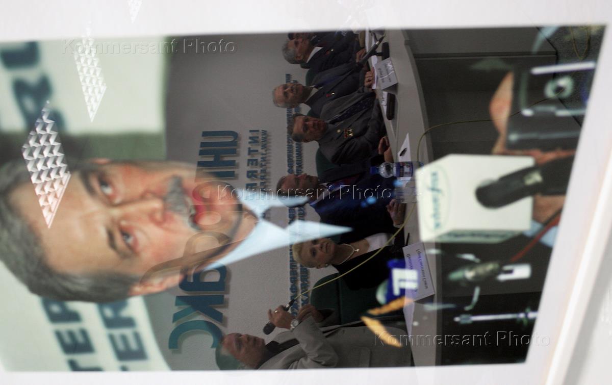 Пресс-конференция на тему: "Какой закон о Героях нужен обществу? Два взгляда". Портрет Бориса Грызлова на стене в центральном офисе информационного агентства "Интерфакс".