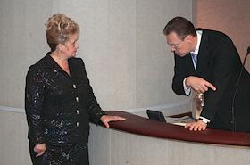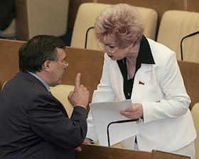 Заместитель председателя Государственной Думы России Любовь Слиска (слева) и полномочный представитель Правительства России в Государственной Думе Андрей Логинов (справа) на очередном думском заседании.