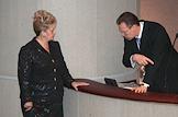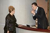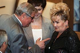 Член фракции Коммунистической партии России (КПРФ) в Государственной Думы России Виктор Илюхин (слева) и член Комитета Государственной Думы России по культуре Любовь Ближина (справа) на очередном думском заседании.