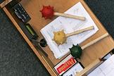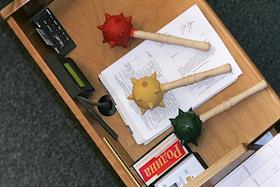 Заседание Государственной Думы России. Красная, желтая и зеленая булавы для голосования на столе депутата.