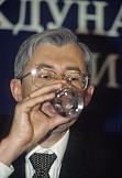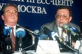 Председатель Российского акционерного общества "Газпром" Рем Вяхирев (слева) и глава холдинга "Медиа-Мост" Владимир Гусинский (справа) на пресс-конференции телекомпании НТВ и РАО "Газпром".