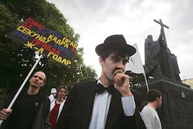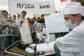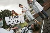 Театрализованная акция в поддержку Музея кино, которому грозит выселение из здания Киноцентра на Пресне. Митинг прошел на Славянской площади.