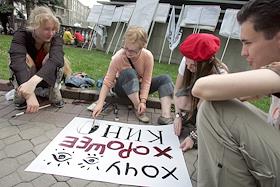 Участники театрализованной акции в поддержку Музея кино, которому грозит выселение из здания Киноцентра на Пресне пишут плакат с надписью "Хочу хорошее кино!". Акция прошла на Славянской площади.