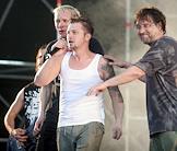 Лидер группы "ДДТ" Юрий Шевчук (справа) и лидер группы "Пилот" Илья Черт (в центре) на юбилейном концерте по случаю 25 - летия группы "ДДТ" на стадионе "Петровский".