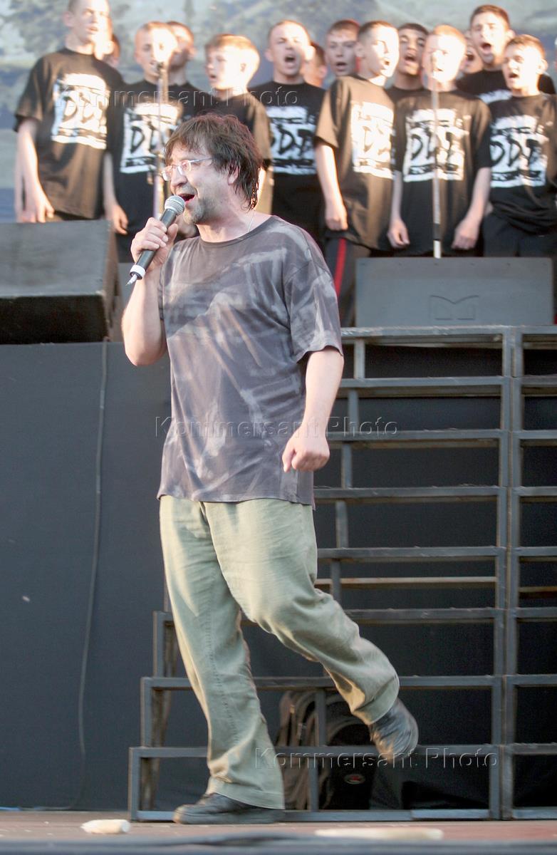 Лидер группы "ДДТ" Юрий Шевчук на юбилейном концерте по случаю 25 - летия группы "ДДТ" на стадионе "Петровский".
