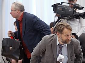 Генеральный директор Института региональных проблем Максим Дианов (сидит) и сопредседатель Совета по национальной стратегии Иосиф Дискин (стоит) на экспертной дискуссии "Российский триколор с "оранжевым" оттенком, или Факторы нестабильности 2005 - 2008". Дискуссия прошла в ИА "Росбалт".