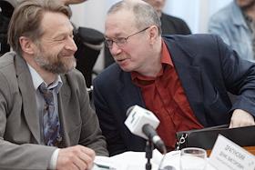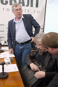 Генеральный директор Совета по национальной стратегии (СНС), политолог Валерий Хомяков (стоит) и писатель, лидер Национал-большевистской партии (НБП) Эдуард Лимонов (сидит) на экспертной дискуссии "Российский триколор с "оранжевым" оттенком, или Факторы нестабильности 2005 - 2008". Дискуссия прошла в ИА "Росбалт".