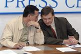 Член политсовета "Республиканской партии России" Владимир Лысенко (слева) и член Комитета Государственной Думы России по делам Федерации и региональной политике Владимир Рыжков (справа) во время пресс-конференции на тему: "Второе рождение Республиканской партии России". Пресс-конференция прошла "Независимом пресс-центре".