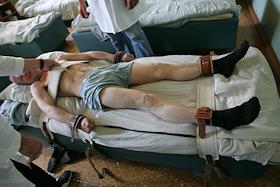 Орловская психиатрическая больница специализированного типа с интенсивным наблюдением. Отделение судебно - психиатрической экспертизы, где проходит обследование граждан, совершивших уголовные преступления. Пациент, прикованный к кровати смирительными ремнями.