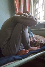 Больной сидит на кровати в палате отделения судебно - психиатрической экспертизы Орловской психиатрической больницы специализированного типа с интенсивным наблюдением. В отделении проходят обследование граждане, совершившие уголовные преступления.