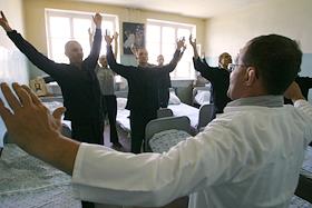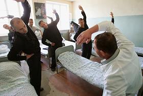 Врач проводит лечебную гимнастику с больными в палате отделения судебно - психиатрической экспертизы Орловской психиатрической больницы специализированного типа с интенсивным наблюдением. В отделении проходят обследование граждане, совершившие уголовные преступления.