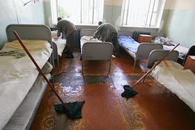 Больные во время уборки в палате отделения судебно - психиатрической экспертизы Орловской психиатрической больницы специализированного типа с интенсивным наблюдением. В отделении проходят обследование граждане, совершившие уголовные преступления.
