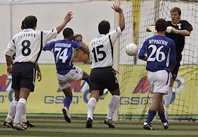 Чемпионат России по футболу. Нападающий команды "Торпедо" Александр Панов (справа) и вратарь "Динамо" Роман Березовский (слева) во время матча "Торпедо" (Москва) - "Динамо" (Москва) (2:1). Матч прошел на стадионе "Лужники".
