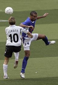Чемпионат России по футболу. Игрок футбольной команды "Динамо" (Москва) Маниш (слева) во время игры с командой "Торпедо" (Москва). Матч прошел на стадионе "Лужники".