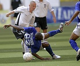 Чемпионат России по футболу. Игрок футбольной команды "Динамо" (Москва) Маниш (справа) во время игры с командой "Торпедо" (Москва). Матч прошел на стадионе "Лужники".