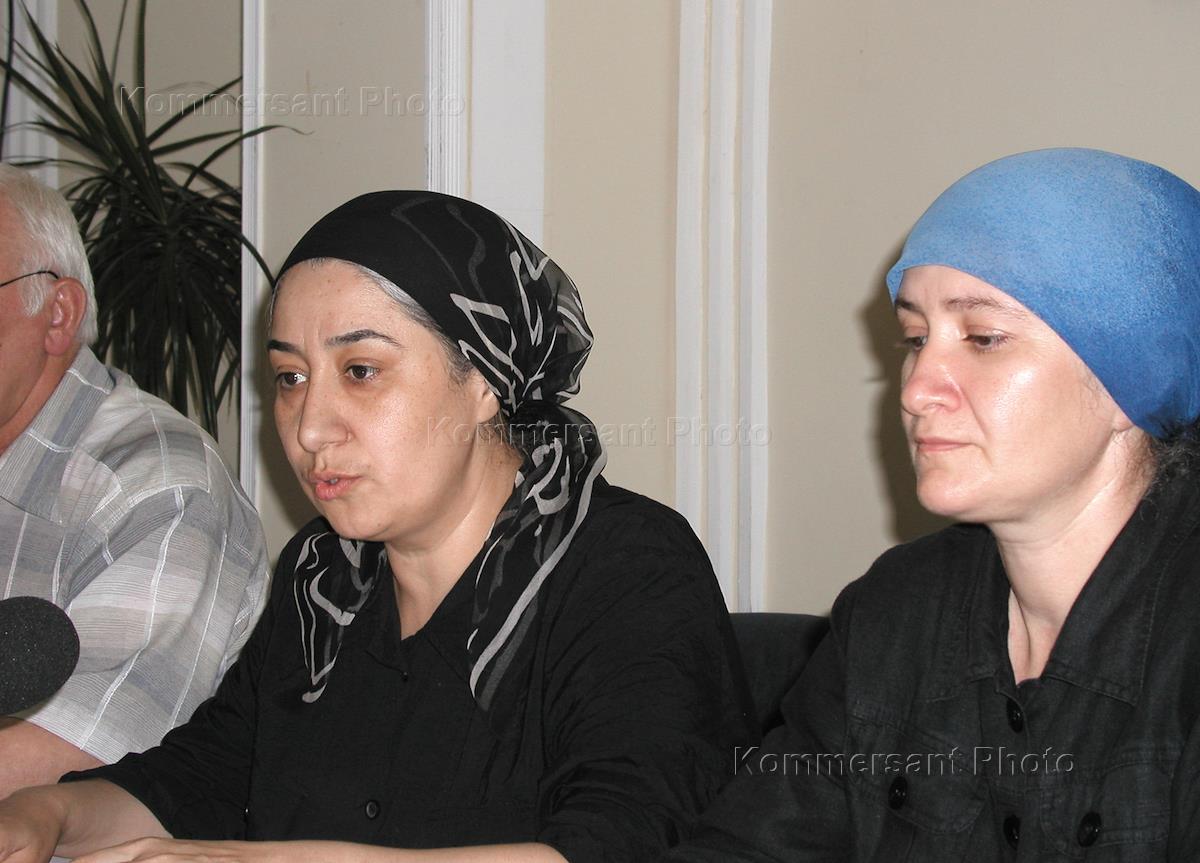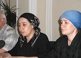 Заседание Верховного суда Северной Осетии по делу единственного оставшегося в живых участника захвата бесланской школы № 1 Нурпаши Кулаева. Потерпевшие Сусанна Дудиева (слева) и Анета Гадиева (справа) на пресс-конференции после заседания.