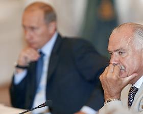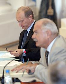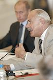Президент России Владимир Путин (слева) и председатель союза кинематографистов России, кинорежиссер Никита Михалков (справа) во время обсуждения перспективы создания в России Общественной палаты. Обсуждение прошло в Кремле.