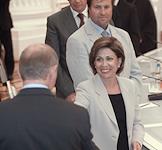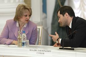 Председатель общероссийского движения "Гражданское достоинство" Элла Памфилова (слева) и заместитель главы администрации Президента России Владислав Сурков (справа) во время обсуждения перспективы создания в России Общественной палаты. Обсуждение прошло в Кремле.