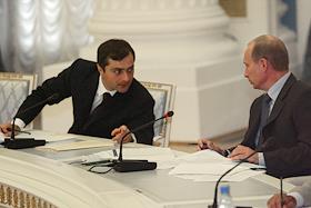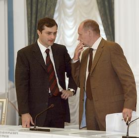 Президент России Владимир Путин (справа) и заместитель главы администрации Президента России Владислав Сурков (слева) во время обсуждения перспективы создания в России Общественной палаты. Обсуждение прошло в Кремле.