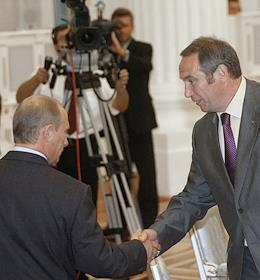 Президент России Владимир Путин (слева) и президент Федерации тенниса России Шамиль Тарпищев (справа) во время обсуждения перспективы создания в России Общественной палаты. Обсуждение прошло в Кремле.