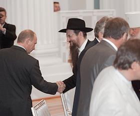Президент России Владимир Путин (слева) и главный раввин Федерации еврейских общин России Берл Лазар (справа) во время обсуждения перспективы создания в России Общественной палаты. Обсуждение прошло в Кремле.