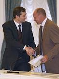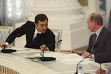 Президент России Владимир Путин (справа) и теннисист Евгений Кафельников (слева) во время обсуждения перспективы создания в России Общественной палаты. Обсуждение прошло в Кремле.