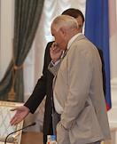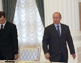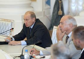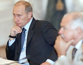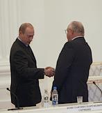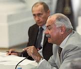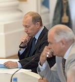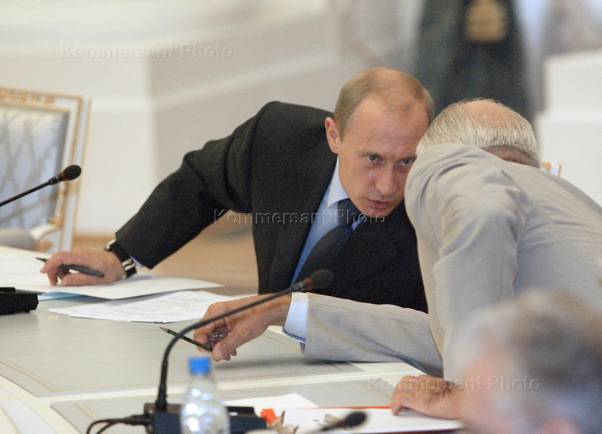 Президент России Владимир Путин (слева) и ректор МГУ Виктор Садовничий (справа) во время обсуждения перспективы создания в России Общественной палаты. Обсуждение прошло в Кремле.
