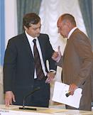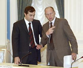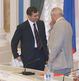 Заместитель главы администрации Президента России Владислав Сурков (слева) и пресс-секретарь Президента России Алексей Громов (справа) во время обсуждения перспективы создания в России Общественной палаты. Обсуждение прошло в Кремле.