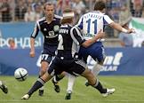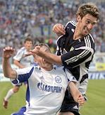 Футбольный матч 19 — ого тура чемпионата России по футболу между командами "Зенит" (Санкт-Петербург) и "Томь" (Томск) на стадионе "Петровский". Встреча завершилась со счетом 1 : 0 в пользу "Зенита". Футболисты Александр Анюков ("Зенит") (слева) и Хорват Вейич ("Томь") (справа) во время матча.