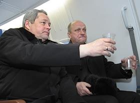 Заместитель полномочного представителя Президента России в Уральском федеральном округе Виктор Басаргин (слева) и председатель правительства Свердловской области Алексей Воробьев (справа) на презентации самолета авиакомпании "Уральские авиалинии".
