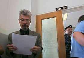 Писатель, лидер Национал-большевистской партии (НБП) Эдуард Лимонов (слева) в здании Никулинского межмуниципального суда, где прошли слушания по делу 40 активистов Национал-большевистской партии, обвиняемых в захвате 14 декабря 2004 года помещения общественной приемной администрации Президента России.