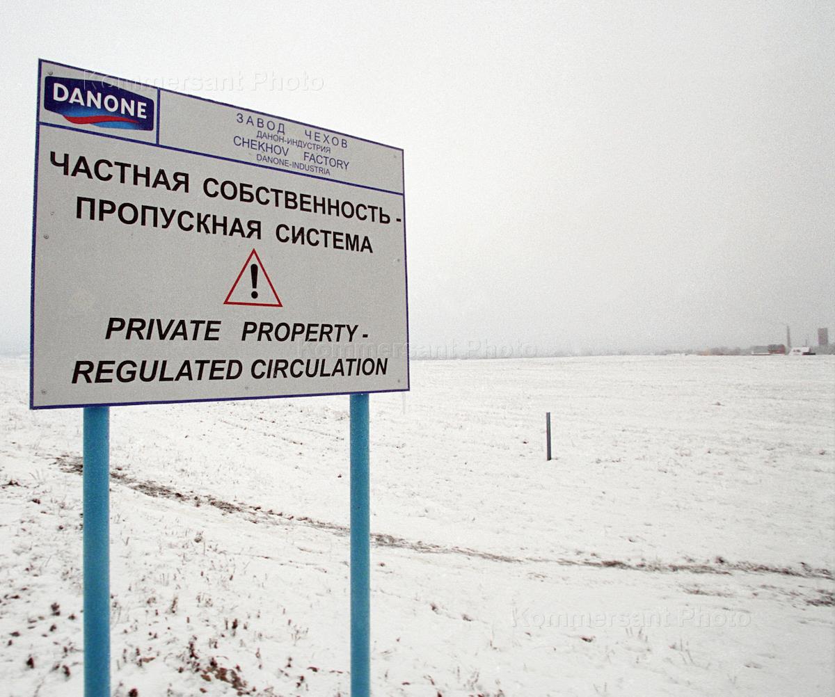 A sign that prohibits entrance to the private territory of the "Danone" products plant in Chekhov.