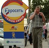 Молодой человек говорит по мобильному телефону на улице на фоне рекламы Салона связи "Евросеть".