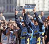 Пилоты команды "Рено" Фернандо Алонсо (слева) и Джанкарло Физикелла (справа) перед началом заезда гонщиков "Mild Seven Renault F 1 Team". Заезд состоялся на Москворецкой набережной.
