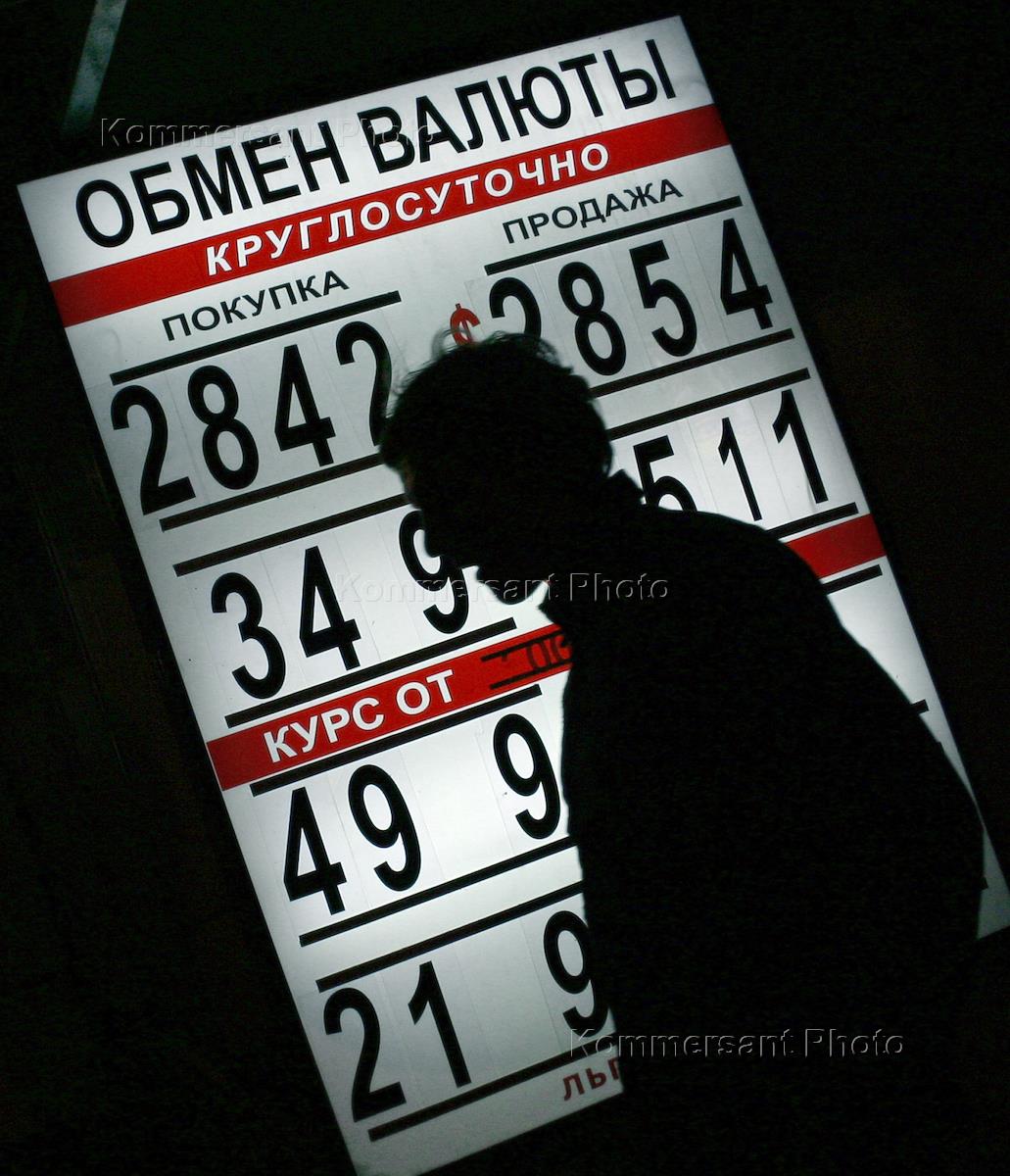 Человек у вывески пункта обмена валюты.