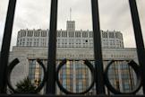 Здание Дома Правительства Российской Федерации за оградой.