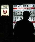 Человек у вывески пункта обмена валюты.