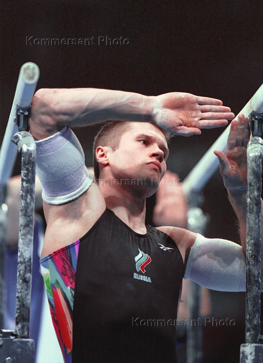 Лидер российской сборной по спортивной гимнастике Алексей Немов во время выступления на XXVII летних Олимпийских играх.