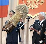 Губернатор Иркутской области Александр Тишанин (слева) принимает поздравления от полномочного представителя Президента в Сибирском Федеральном округе Анатолия Квашнина (справа) на церемонии инаугурации.