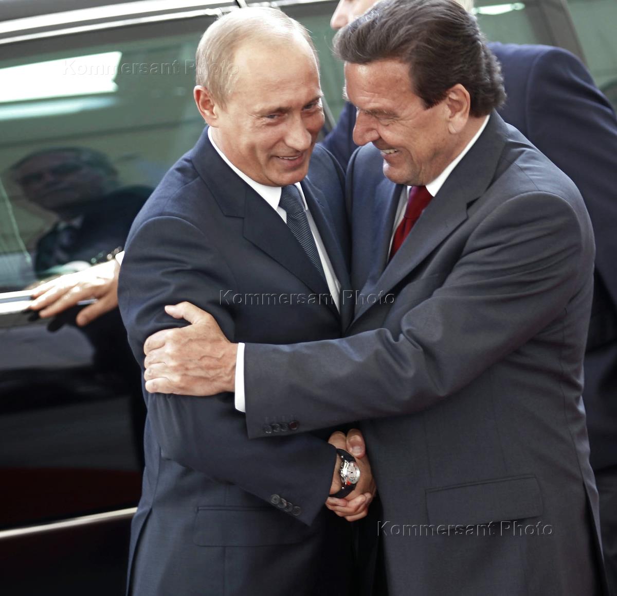Russian President Vladimir Putin, left, and Germany's Chancellor Gerhard Schröder, right, are shown during a meeting in Germany. The main result of the Russian president's visit was the agreement between Russia's Gazprom and Germany's E.ON and BASF on construction of the North European Gas Pipeline.