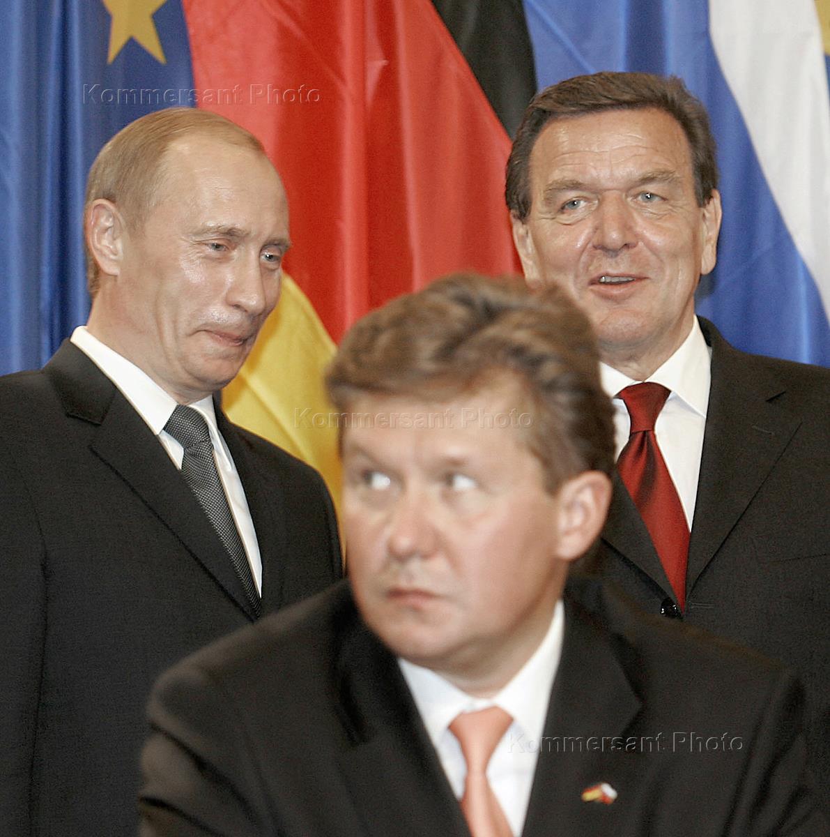 Президент России Владимир Путин (слева), глава РАО "Газпром" Алексей Миллер (в центре) и канцлер ФРГ Герхард Шредер (справа) во время деловой встречи. Главным итогом поездки Владимира Путина в Германию стало подписание соглашения между главами "Газпрома", E.ON и BASF, которое предусматривает строительство газопровода из России в Европу через акваторию Балтийского моря.