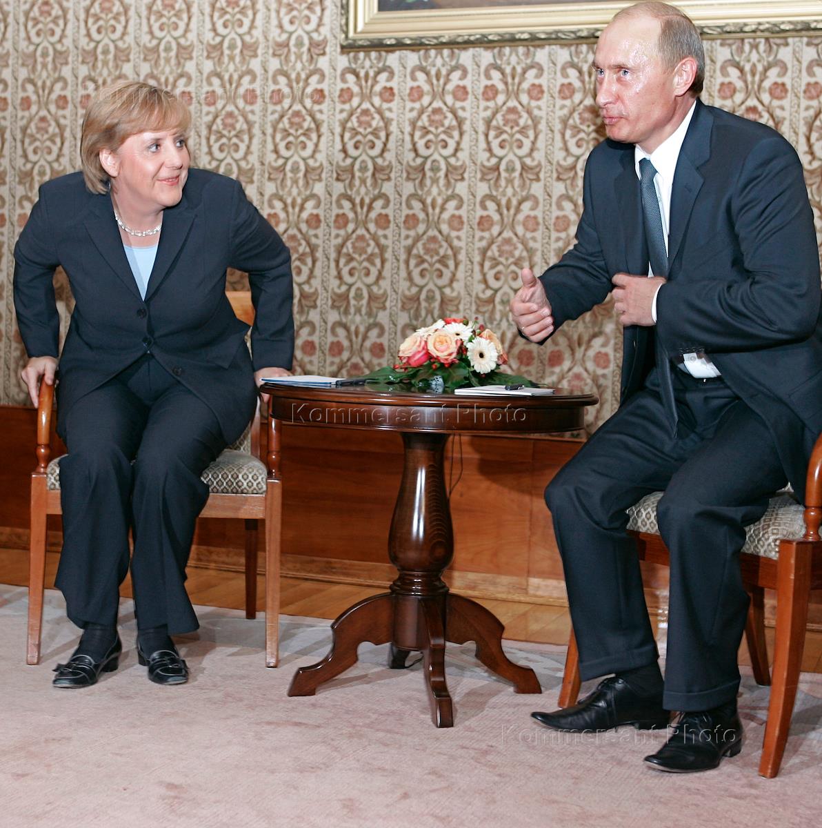 Визит Президента России Владимира Путина в Германию. Главой партии ХДС, кандидат в канцлеры ФРГ Ангела Меркель во время встречи с Владимиром Путиным.
