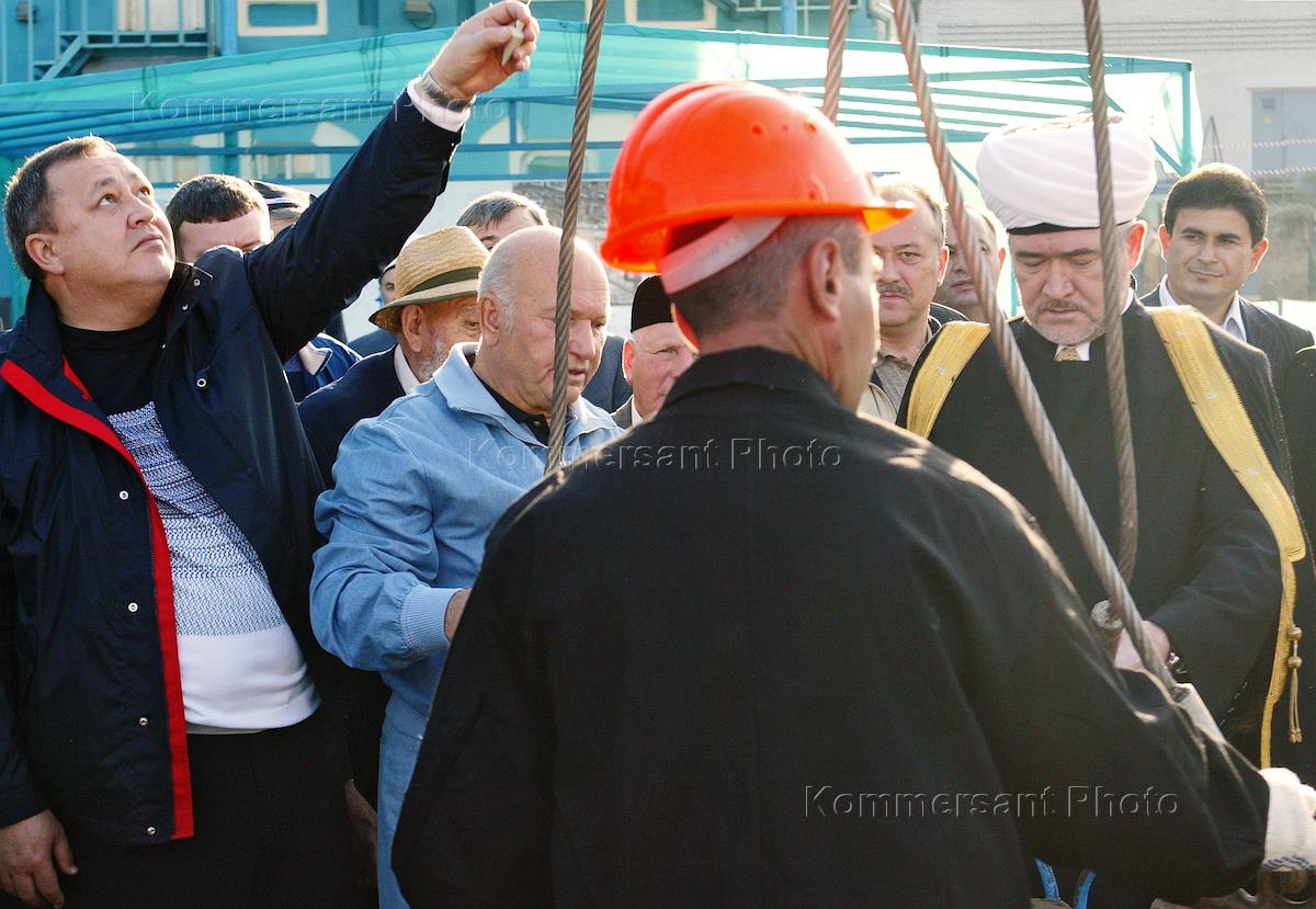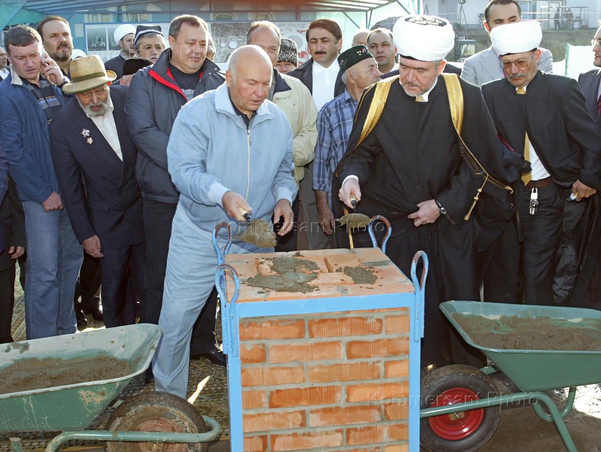 Председатель Совета муфтиев России шейх Равиль Гайнутдин (справа) и мэр Москвы Юрий Лужков (в центре) на торжественной церемонии закладки первого камня в основание нового комплекса Московской соборной мечети.